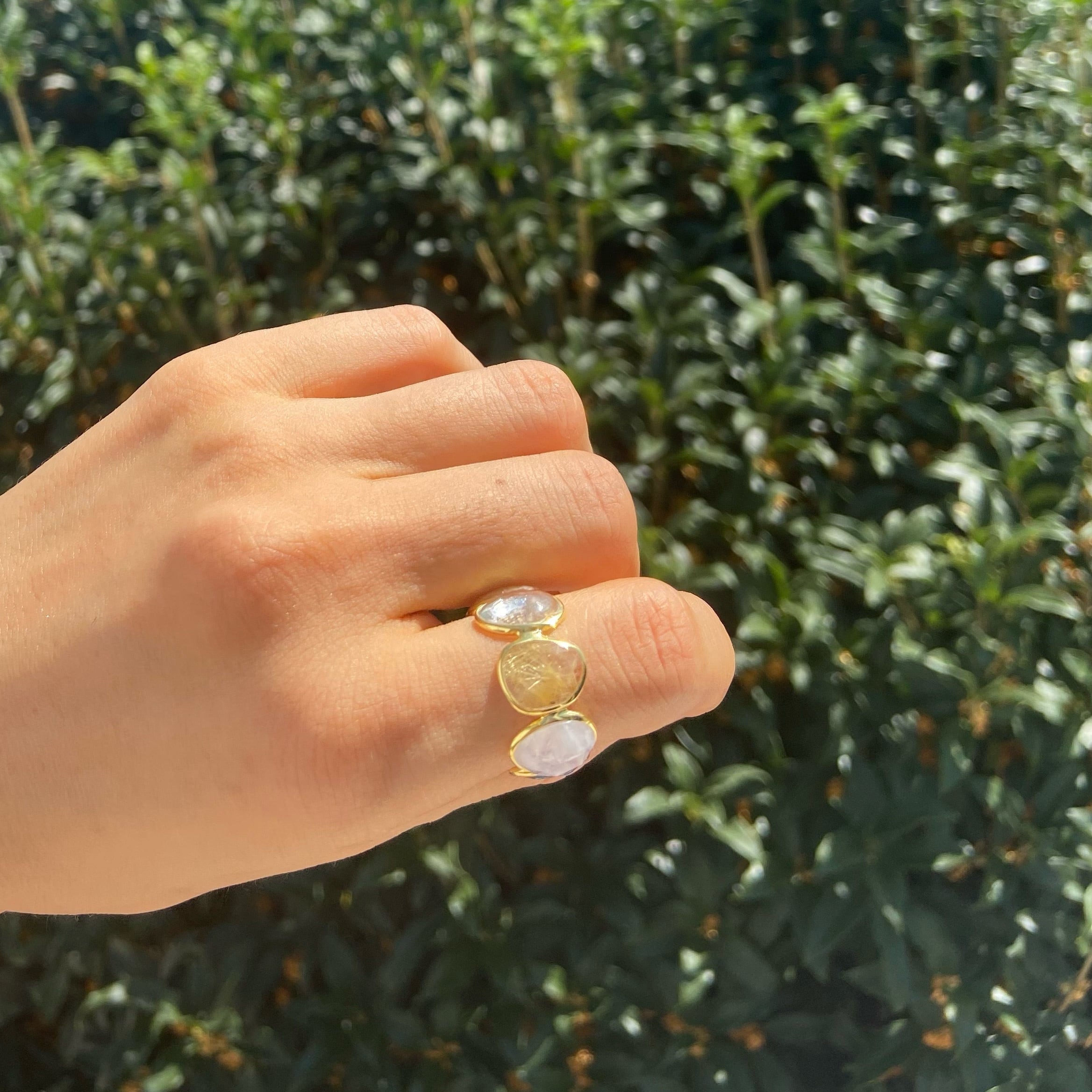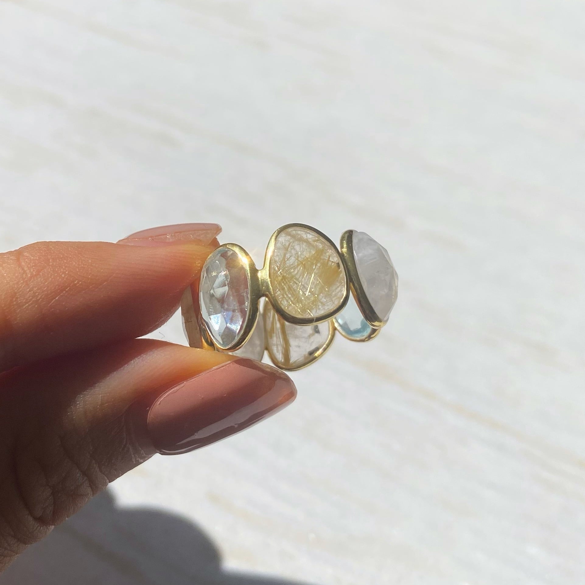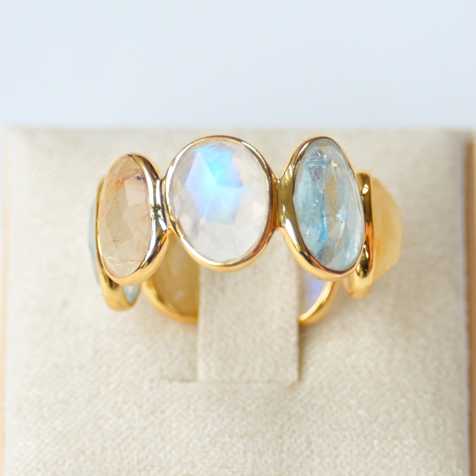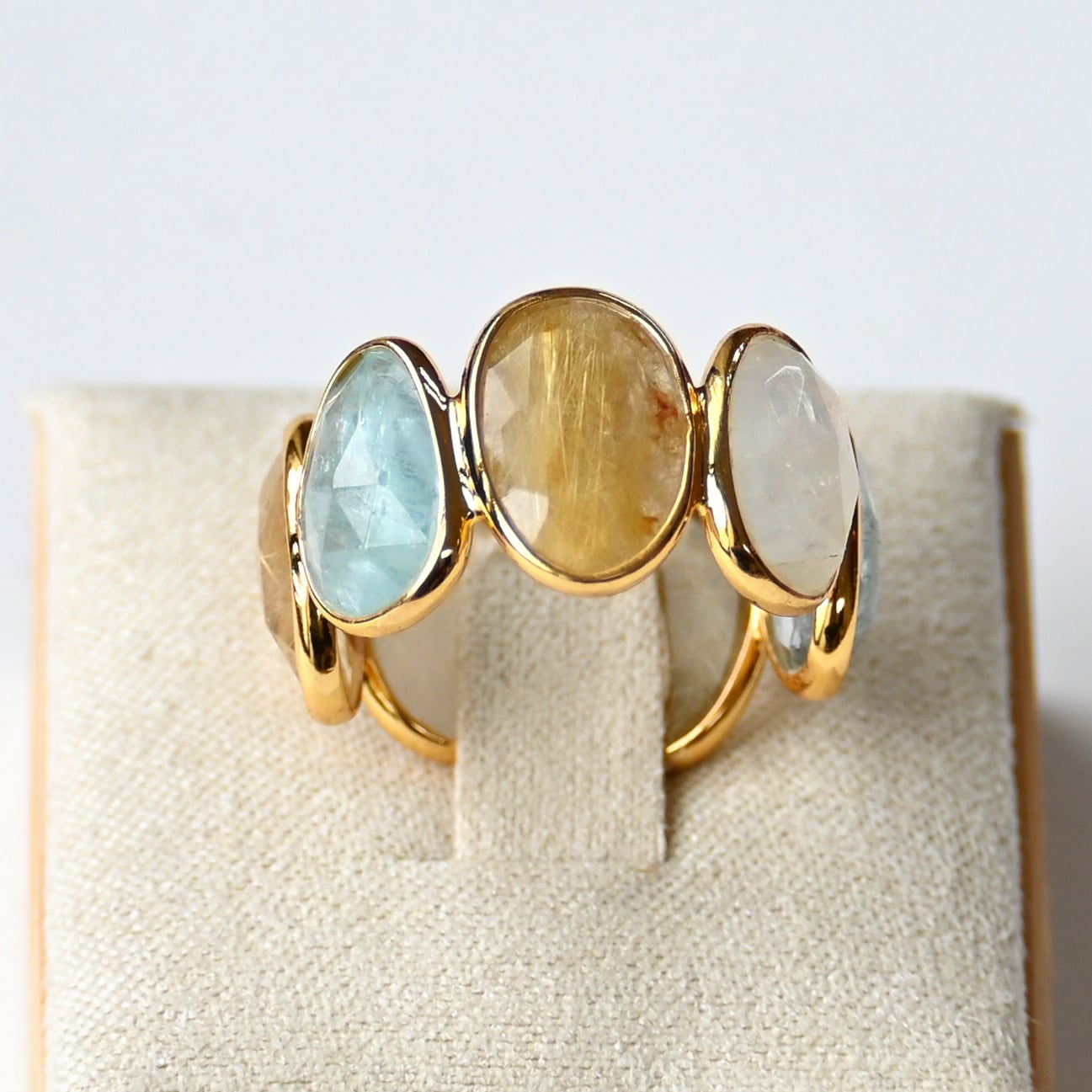 ゴールドの針が放射線状に目映く光るゴールデンルチルクォーツ、キラキラした海のさざめきを想わせる淡いブルーのアクアマリン、光加減でレインボーのシアーが美しいレインボームーンストーン、3種類ストーンのコンビネーションリング。着用位置で全く違った顔が楽しめます。カラーの相性が良いイエローゴールドでコーティングしました。