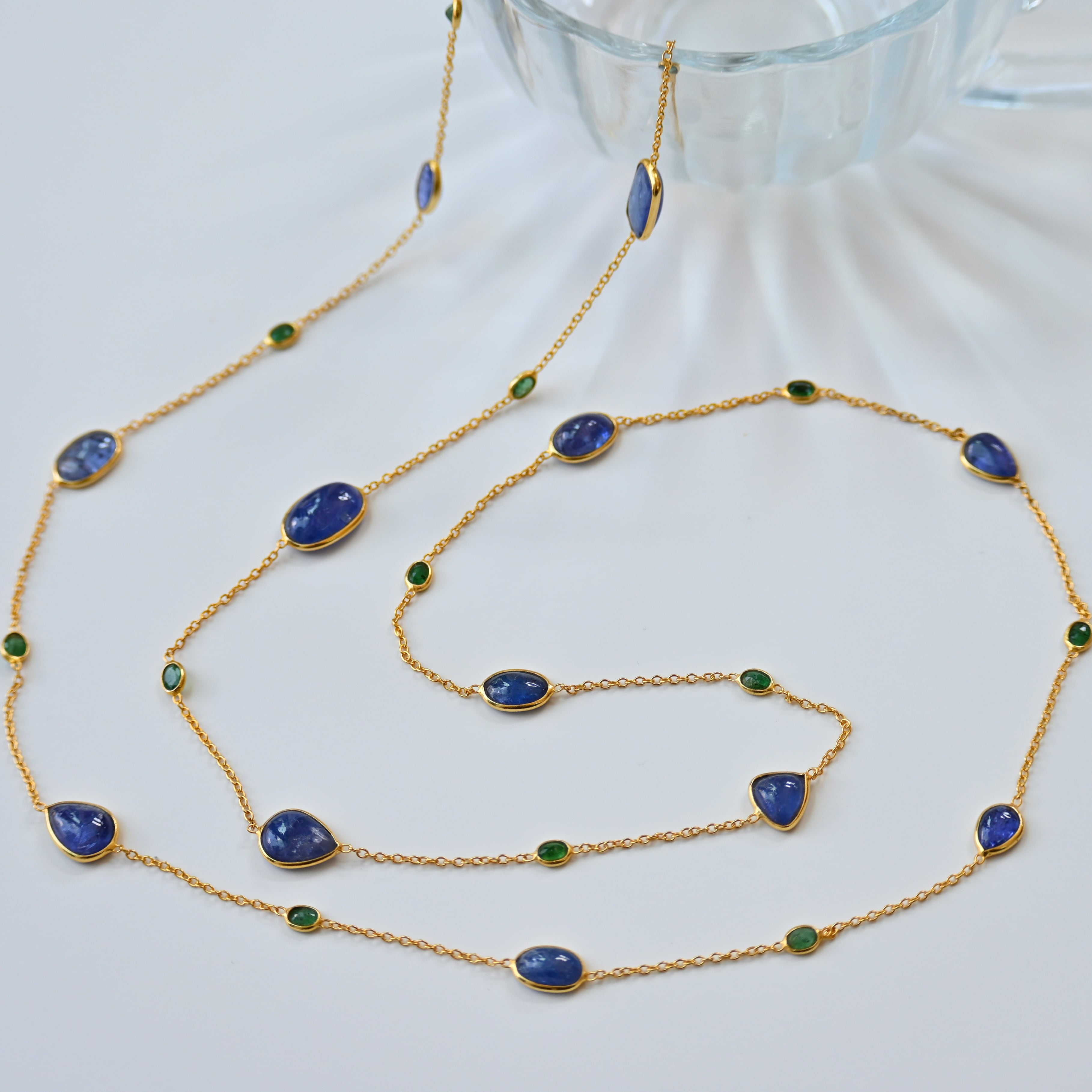 涼やかなブルー発色のタンザナイトと上品なグリーンのエメラルドを使用したロングネックレス。